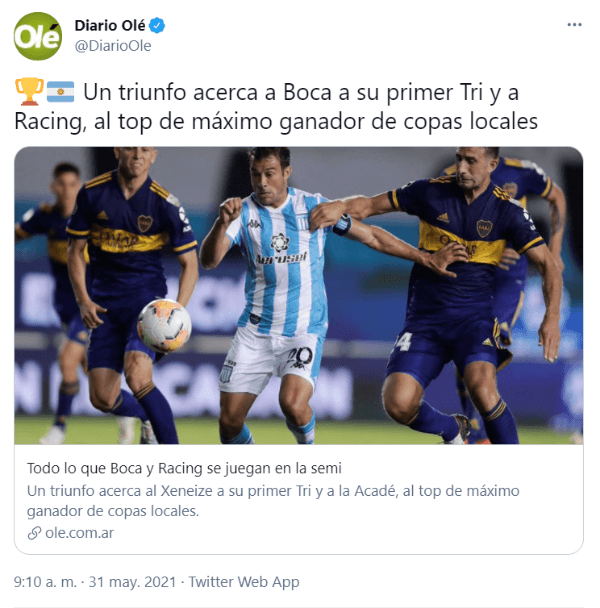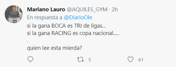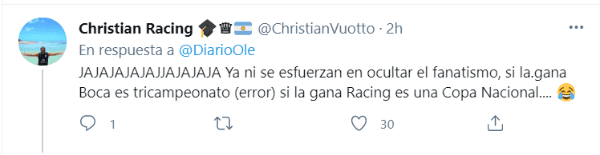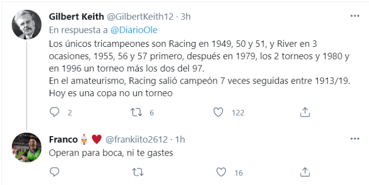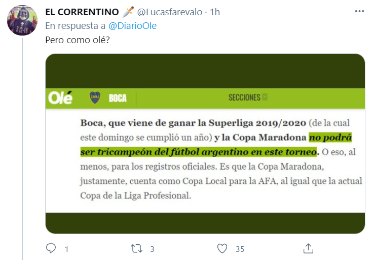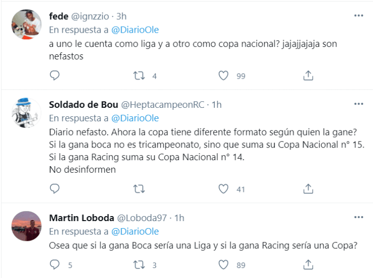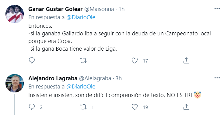 La AFA considera tanto al certamen anterior como al actual como copas nacionales, pero teniendo en cuenta el formato que es más parecido a un torneo que otra cosa, se generó la polémica. Diario Olé, medio deportivo argentino, tiró un tuit hoy afirmando que “un triunfo acerca a Boca a su primer Tri”, por lo que los fanáticos del Millonario explotaron de furia explicando por qué no se puede considerar de esa forma.