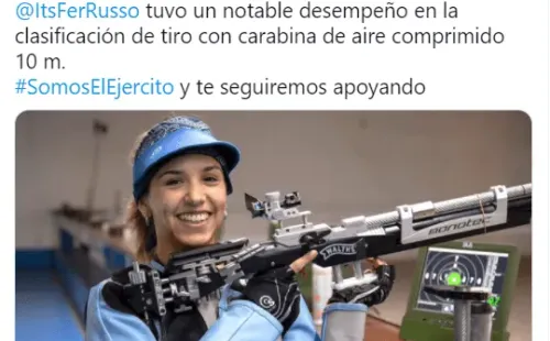 Orgullosos como todo el país por su actuación, el Ejercito Nacional le dedicó un tuit a la joven que hoy reside en La Rioja desde muy corta edad: “#Tokyo2020 Nuestra soldado voluntaria. @ItsFerRussotuvo un notable desempeño en la clasificación de tiro con carabina de aire comprimido 10 m. #SomosElEjercito y te seguiremos apoyando”. ¡Épico!