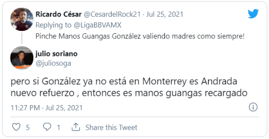 Después del pitazo final del árbitro, los hinchas cargaron contra Andrada y le dijeron “manos guangas” en reiteradas oportunidades. El apodo lo tenía Hugo González, el anterior arquero de Rayados que era muy cuestionado por la afición. Tras su actuación, muchos aseguraron que no hay diferencias entre el que se fue y Sabandija.