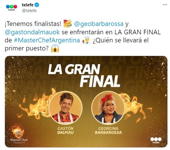 VER EN VIVO | ¡YA COMENZÓ LAGRAN FINAL!El certamen culinario más importante de Argentina y el más visto por la teleaudiencia del país está llegando a su fin. Una vez más,Masterchef Celebrityvolvió a ser el centro de atención en cada uno de los programas llevados a cabo. Es por ello que el público aguarda con una gran expectativa el desenlace del mismo. Los aspirantes al trofeo de campeón son los actores Georgina Barbarossay Gastón Dalmau. Enterate cómo, cuándo y dónde verla,qué premios se llevará el ganador y mucho más.