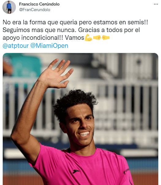 En una semana que recordará durante mucho tiempo, que puede ser el inicio de grandes resultados en una carrera que tiene demasiado por delante, el tenista de 23 años no solamente ganó en Miami su primer partido de Masters 1000 sino que ahora se encuentra entre los cuatro mejores de un certamen de esta índole, el resultado más importante en lo que va de su trayectoria. Su arribo a semis se produjo luego de vencer al italiano Jannick Sinner en el abandono del italiano por lesión cuando este perdía 4-1 en el primer set. 22 minutos de juego.