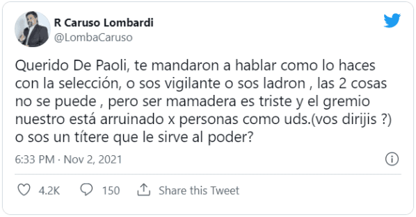 Fiel a su estilo, el ex-DT de San Lorenzo y Racing salió al cruce por Twitter: “Querido De Paoli, te mandaron a hablar como lo haces con la Selección. Osos vigilante o sos ladron, las 2 cosas no se puede. Pero ser mamadera es triste y el gremio nuestro está arruinado por personas como ustedes. ¿Vos dirijís o sos un títere que le sirve al poder?”. ¡Fuerte!