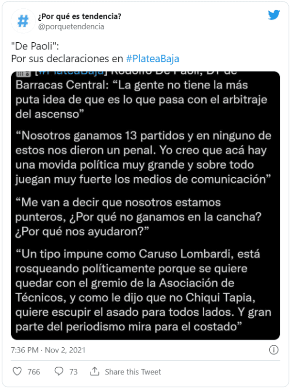 En el medio la ligó Ricardo Caruso Lombardi, uno de los que más aprovecha los medios para exponer al arbitraje: “Un tipo impune como Caruso Lombardi está rosqueando políticamente porque se quiere con el gremio de la Asociación de Técnicos. Y como el Chiqui Tapia le dijo que no, quiere escupir el asado para todos lados. Y gran parte del periodismo mira para el costado”.