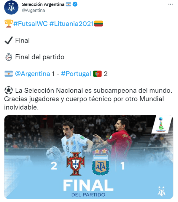 Finalizó una nueva y exitosa participación de la Selección Argentina en la Copa del Mundo. Fue derrota por 2-1 ante Portugal en la final de Lituania 2021, gracias a los tantos de Pany Varela -2- para el conjunto europeo yÁngel Claudino en favor de los dirigidos por Lucuix. Con este resultado, la Albiceleste no pudo repetir el título conseguido en Colombia 2016 y se lleva la medalla plateada luego de una increíble actuación mundialista.