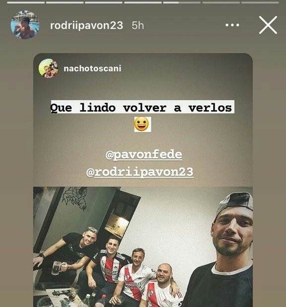 “Que lindo volver a verlos”, escribió el usuario @nachotoscani, quien subió la imagen, en la que se ve a tres de los cinco integrantes con la camiseta de River, seguramente viendo el duelo de ayer ante Colón de Santa Fe.