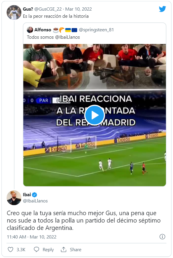 De alguna manera el tuit le llegó a Ibai, y este no se quiso quedar callado. La respuesta fue tan dura que no tardó en hacerse viral: “Creo que la tuya sería mucho mejor Gus, una pena que nos sude a todos la polla un partido del décimo séptimo clasificado de Argentina”.