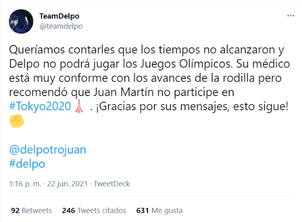 “Queríamos contarles que los tiempos no alcanzaron y Delpo no podrá jugar los Juegos Olímpicos. Su médico está muy conforme con los avances de la rodilla pero recomendó que Juan Martín no participe en #Tokyo2020 . ¡Gracias por sus mensajes, esto sigue!”, fue el mensaje que dio el equipo del tandilense.