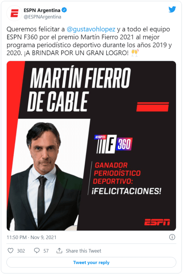 El conductor del programa no estuvo presente en el evento y es por eso que quienesfueron a recibir el premio fueronGuillermo Poggi,Leonardo Gentili y el resto del equipo. “¡A brindar por el gran logro!”, escribió la cuenta oficial de ESPN Argentina.