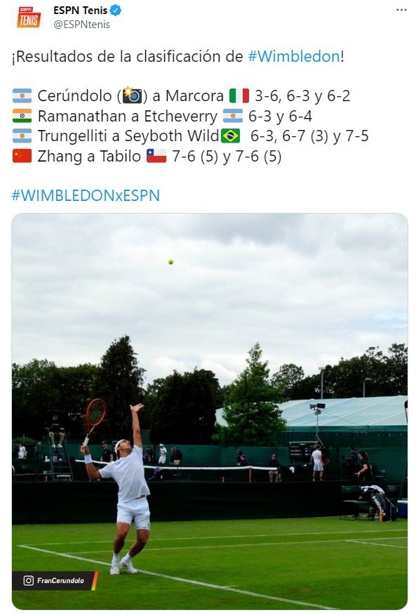 Por la tercera ronda de la qualyde Wimbledon, donde el ganador se meterá en el cuadro principal del certamen, Marco Trungelliti(206) chocará con el neerlandés Botic Van de Zandschulp (139). El duelo estará gestandose desde lacancha 5 del All England Lawn Tennis and Croquet Club estejueves 24 de junio, con transmisión EN VIVOyEN DIRECTOde ESPN Play.Primera vez que se enfrentan de manera oficial entre sí.