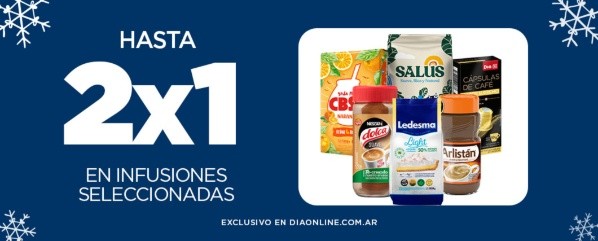 Estas grandes ofertas están disponibles hasta el próximo miércoles, inclusive, en la página web de Día: ¿Cuáles son? Hasta 2 x 1 en golosinas y chocolates, hasta 2 x 1 en harina y premezclas y hasta 2 x 1 en infusiones y endulzantes.