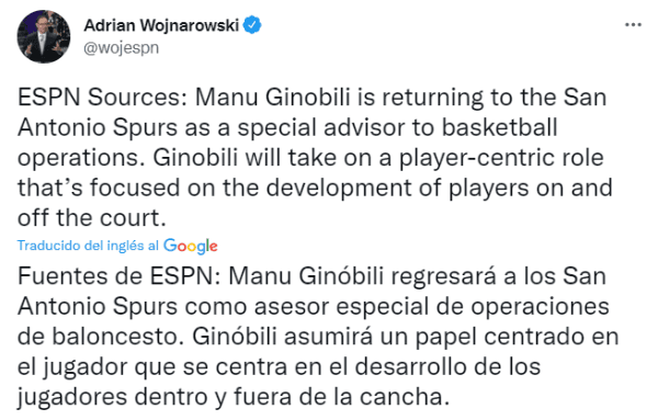 Durante estos días mucho se habló de la enorme posibilidad de que Manu pudiera ingresar al prestigioso Salón de la Fama de la NBA. Mientras tanto, la noticia de hoy pasó por otro lado y la comunicaron los insiders de la liga. El periodista Adrian Wojnarowski anunció que “Manu Ginóbili regresará a los San Antonio Spurs como asesor especial de operaciones de baloncesto”. La vuelta del ídolo.
