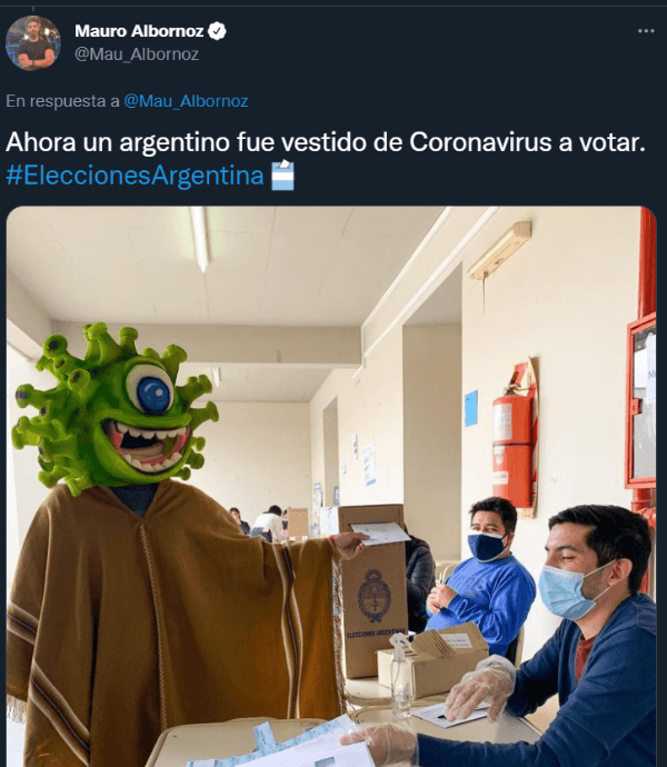 Pero eso no fue todo. Al mismo tiempo, en otro centro escolar argentino, otro ciudadano acaparó las miradas de todos los presentes. En esta oportunidad, el hombre se hizo presente disfrazado, nada más ni nada menos, que de coronavirus.