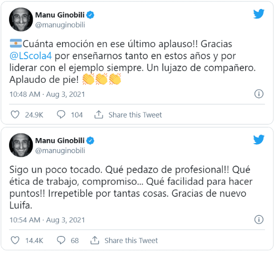 Instantes después de ese inolvidable momento, otra leyenda como lo es Manu Ginóbili decidió dedicarle unas palabras a través de su cuenta oficial de Twitter: “¡Cuánta emoción en ese último aplauso!Gracias Luis por enseñarnos tanto en estos años y por liderar con el ejemplo siempre. Un lujazo de compañero. ¡Aplaudo de pie!”.