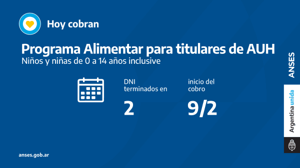 En el marco delPlan Argentina contra el Hambredel Ministerio de Desarrollo Social, ANSES acompaña con el pago del programa Alimentar.Hoycobran titulares de AUH con documentos finalizados en2en la misma cuenta de la prestación.