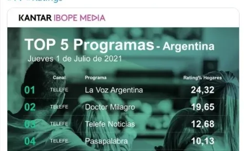 Otra vez, y como nos tiene acostumbrados desde el arranque del 2021,Telefedominó plenamente las mediciones contraEl Trecey fue una diferencia más que notable entre uno y otro. En cuanto aLa Voz Argentina, si bien su promedio final fue de24,32, el ciclo que tiene al jurado compuesto porRicardo Montaner, Lali Espósito, Mau y Ricky y Soledad Pastorutti supo tocar los26como pico, en un comienzo y consolidación realmente impresionante.Todos los números informados son cortesía de la empresa Kantar Ibope.