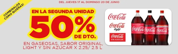 ¿Papá es fanático de las gaseosas? No te podés perder esta súper oferta en Coca-Cola. Sí, de la segunda unidad sólo pagás el 50 %. ¿Y si le gusta el vino o los espumantes? También allí aparecen ofertas imbatibles: 3X2 en vinos, espumantes y sidras para brindar en un domingo tan especial.