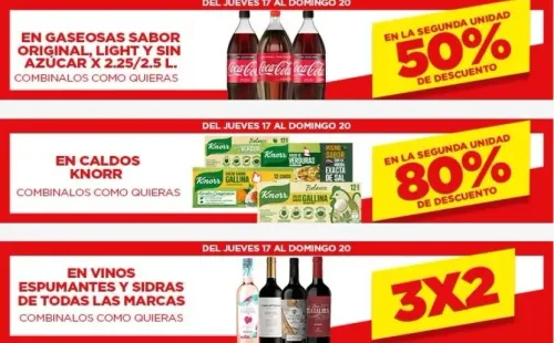 Por ejemplo, en materia gaseosas, a partir deljueves 17 de junioy hasta eldomingo 20, hay un50% de descuento en la segunda unidad de laCoca-Cola(no incluye productos vinculados a esta empresa). Siguiendo con estos mismos días de promoción, podés aprovechar el3×2envinos, espumantesysidras de TODAS las marcas, por lo cual tenés permitido combinarlo de la forma que quieras.