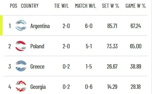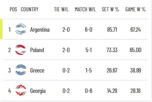 La fecha arrancará con el partido de Federico Delbonis (44°) ante Kamil Majchrzak (117°), este martes cerca de las 20. Argentina llega en la primera ubicación mientras que Polonia está segunda. La fase de grupos finalizará el jueves para pasar a las semifinales, en las que el ganador del grupo de Argentina se enfrentará al del A, que podría ser España.