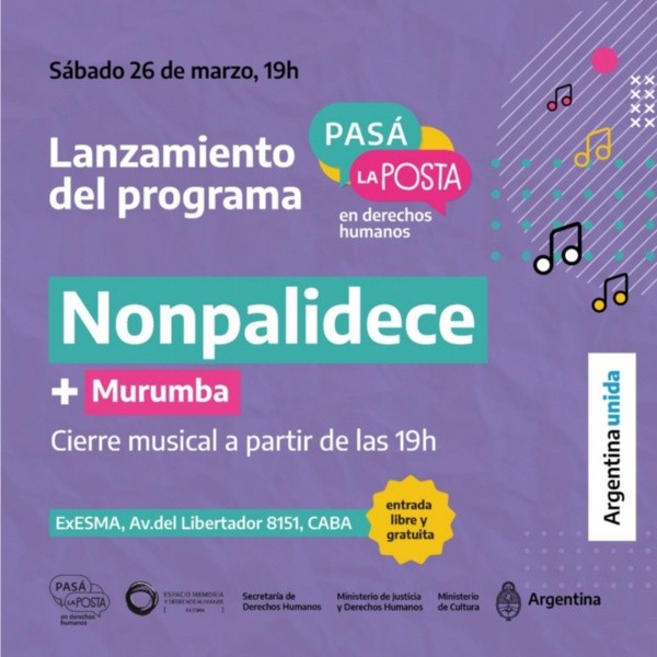 A las 19 h, será el cierre musical de la presentación del Programa “Pasa la posta”, organizado en articulación por la Secretaría de Derechos Humanos de la Nación para la formación de multiplicadores Territoriales en Derechos Humanos en el predio de la ex ESMA.