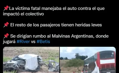 En ese contexto, se dio un trágico accidente la ruta 40 que involucró a un micro que trasladaba desde San Juan una congregación de hinchas de River. Alrededor de las 10 de la mañana en el departamento mendocino de Lavalle, el omnibus chocó con un auto particular reconocido como un Volkswagen Gol y lamentablemente, la conductora del vehículo falleció.