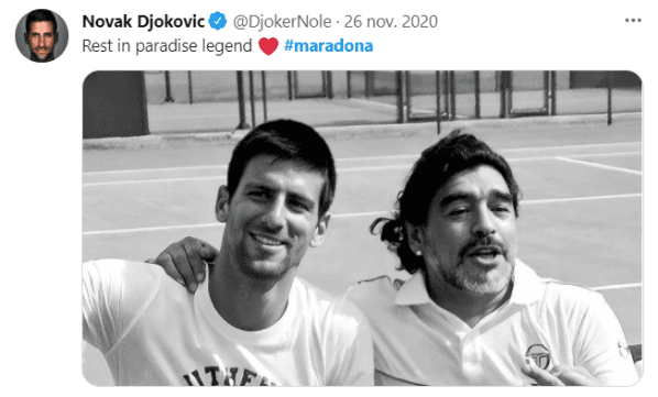 Uno de los mejores tenistas de la historia en compañía de D10S. Diego agarró la pelota de tenis y empezó a hacer las maravillas que solo él sabe;Djokovic no salió de su asombro. En la jornada posterior al fallecimiento de Maradona, Nole posteó vía Twitter la imagen de aquel momento junto a un mensaje para uno de sus ídolos.
