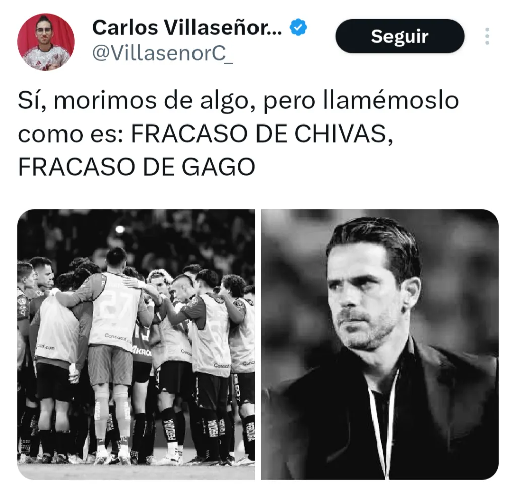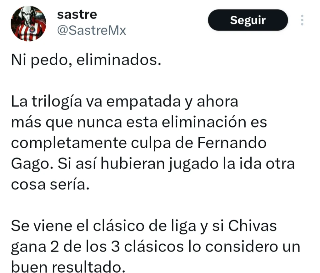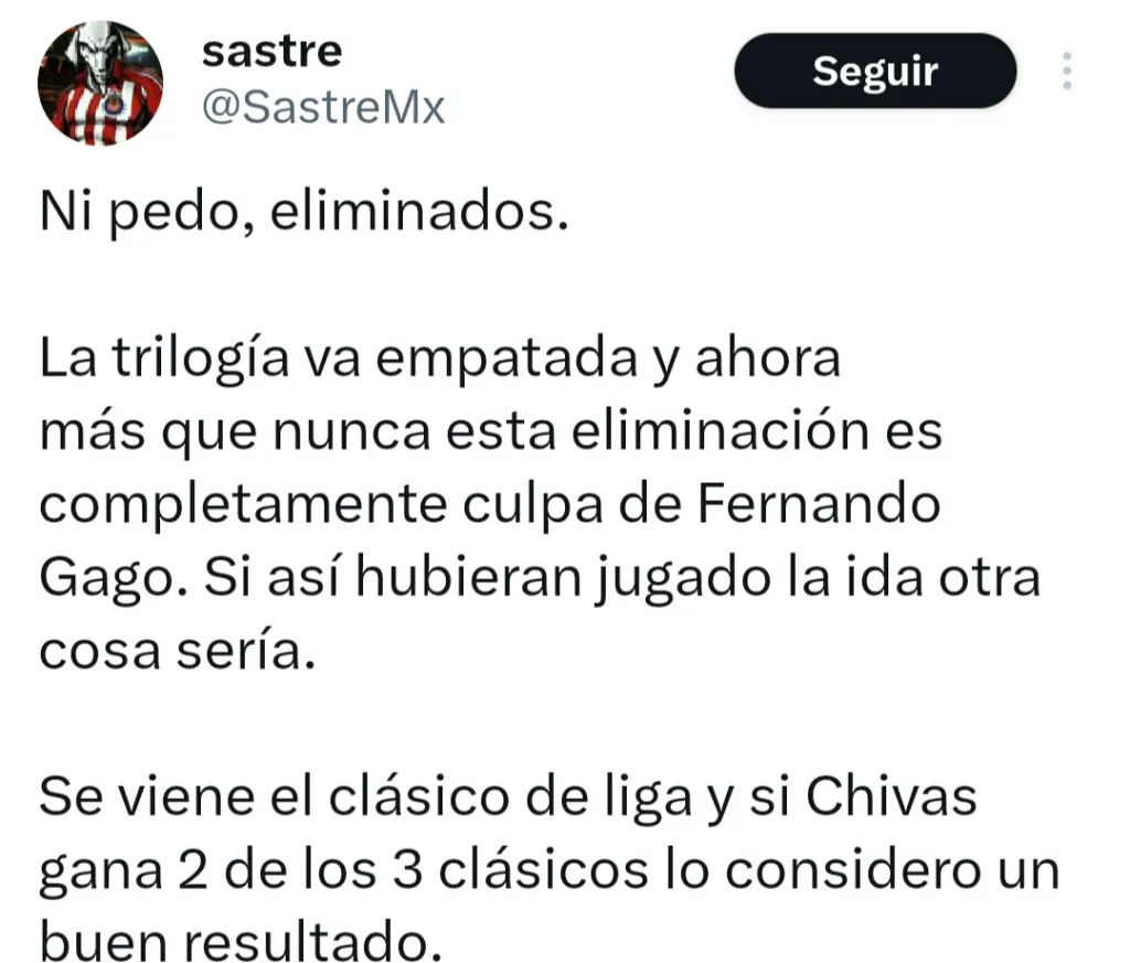 “No, pendejo, ningún Chivahermano está feliz. A menos que Gago gane el clásico de Liga, se meta hasta la final Y la gane, ningún Chivastardo estará feliz”, se remarcó desde La Super Chiva. “Si Torres no se hubiera echo expulsar. Si Gago no la hubiera cagado con los cambios en la ida. Si Mozo no hubiera metido autogol. Fracaso y mucho que cuestionar. Pero hoy demostraron que con huevos y sin salir cagados pueden competir”, opinó Freddy Tolentino. Incluso más tajante en su consideración fue Carlos Villaseñor: “Sí, morimos de algo, pero llamémoslo como es: FRACASO DE CHIVAS, FRACASO DE GAGO”.