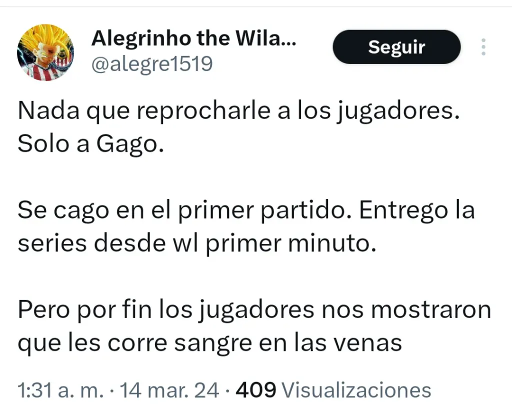 “Se acabó el sueño. Ya no ajusta el tiempo. Ojalá Gago salga con todo para mínimo romper la racha sin ganar en el Akron”, publicó en X la cuenta Chivas Shitposting, haciendo referencia a un nuevo clásico ante América que Guadalajara deberá afrontar este domingo y como local, por la decimosegunda fecha del Clausura 2024 de la Liga MX.