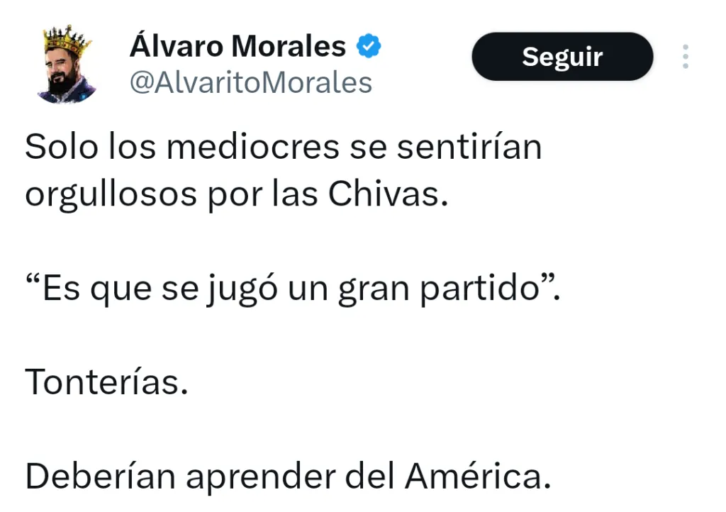Quién estaba esperando con servilleta al cuello la revancha entre Chivas de Guadalajara y América fue Álvaro Morales, uno de los principales detractores de Lionel Messi en la prensa mundial, quien venía siendo muy crítico del exentrenador de Racing. “Solo los mediocres se sentirían orgullosos por las Chivas. ‘Es que se jugó un gran partido’. Tonterías. Deberían aprender del América”, escribió en X.