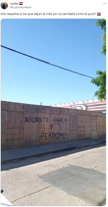 En una de las tribunas que está aún en construcción, los Funebreros plagaron las paredes con mensajes de apoyo hacia Perdomo, capitán y referente del equipo.