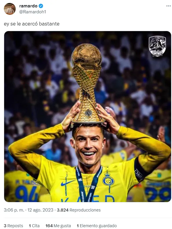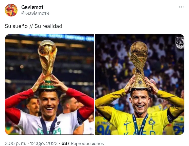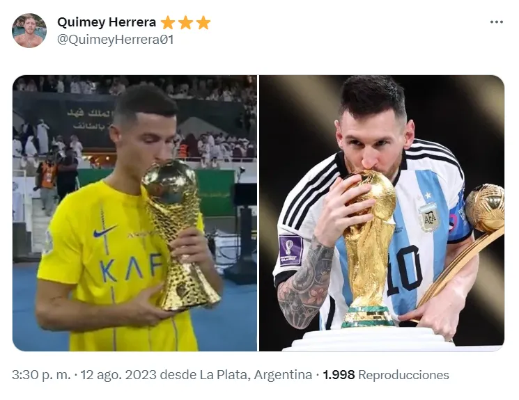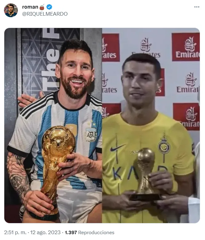 Lo cierto es que más allá del partido, lo que más llamó la atención fue el diseño del trofeo de esta competición, ya que es muy similar al de la Copa del Mundo. Teniendo en cuenta que Lionel Messi la levantó hace casi 8 meses, los memes no tardaron en aparecer.