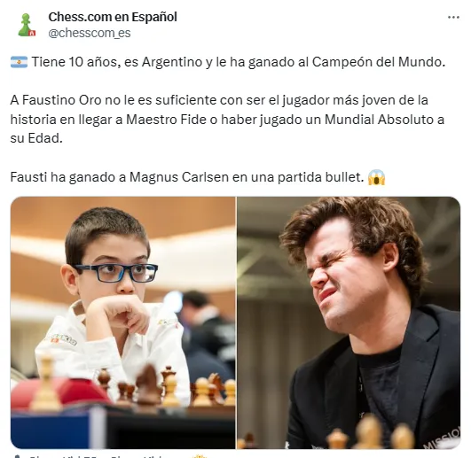 Unir la frase “otro día en la oficina” con un niño de 10 años suena incoherente, pero Faustino Oro le volvió a dar sentido. El “Messi del ajedrez”, como se lo empezó a conocer popularmente, se lució sobre el tablero y le ganó ni más ni menos que al campeón del mundo, el noruego Magnus Carlsen, para hacer historia una vez más.