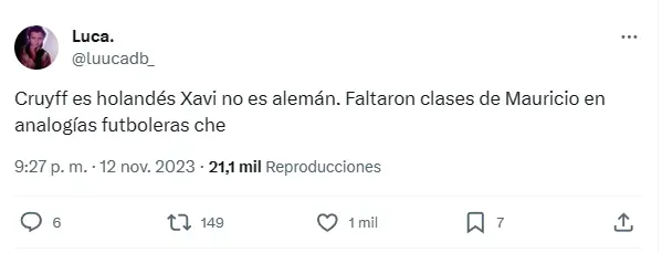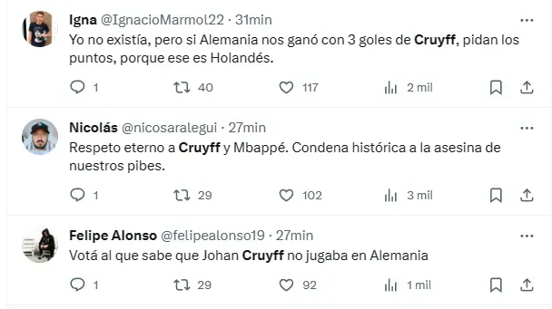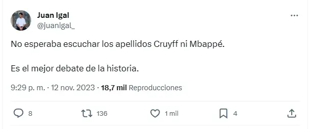 “Con ese criterio, cuando Alemania en el 74 le hizo cuatro goles a Argentina, Cruyff la rompió e hizo un desastre, vos tendrías que considerar que Cruyff es un pésimo jugador. O con los goles que nos hizo Mbappé en la final tendrías que despreciarlo porque nos hizo dos goles. Digamos, una cosa no tiene que ver con la otra. Nos tocó una guerra y la perdimos”, fue lo que dijo Javier Milei, en relación a dos partidos de la Selección Argentina en Mundiales.