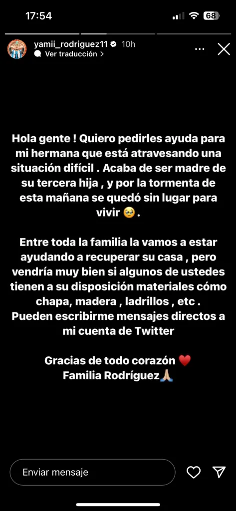 La futbolista de 25 años se encargó de emitir un desesperado comunicado, acompañado de un pequeño video para detallar lo ocurrido, donde destacó que su hermana “acaba de ser madre de su tercera hija, y por la tormenta de esta mañana se quedó sin lugar para vivir”.