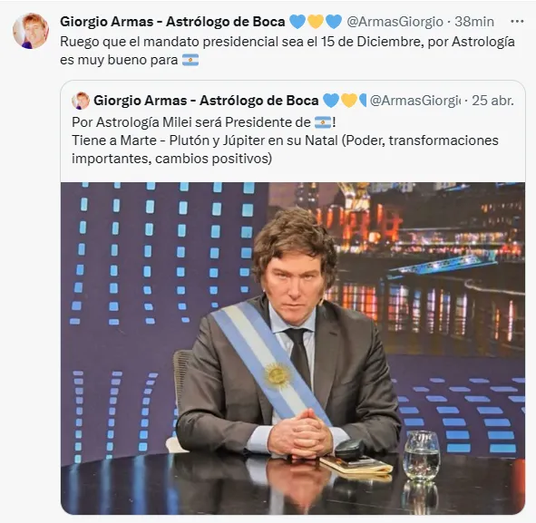 A continuación, llegó su primer posteo. Y qué posteo… Cerca de las ocho menos cuarto de la noche, Giorgio Armas dio por ganador a Javier Milei en el balotaje contra Sergio Massa y dio la fecha exacta en la que debería asumir para que todo vaya bien. “Ruego que el mandato presidencial sea el 15 de diciembre, por Astrología es muy bueno para Argentina”, escribió en X.