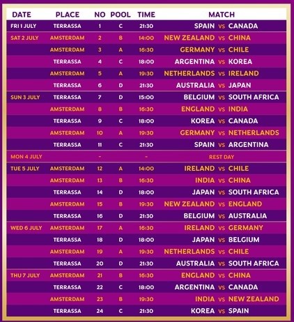Tras los dos partidos ante India los días18 y 19 de junio, Argentina se trasladará a Terrassa, España, donde esperará el debut del 2 de julio ante Corea del Sur.Además, Argentina comparte Grupo C con España y Canadá.