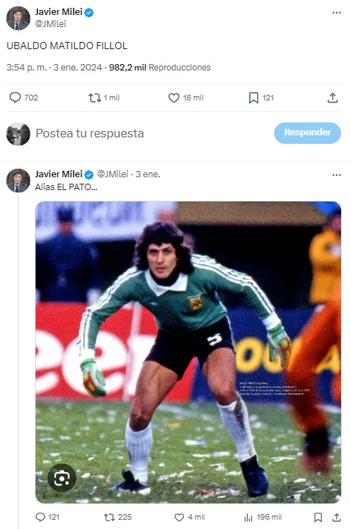 A pocas semanas de haber asumido como Presidente, Milei se hizo presente en X a través de su cuenta personal para responder una encuesta de TNT Sports. Aquel 3 de enero, el mandatario contestó en mayúsculas “UBALDO MATILDO FILLOL” y acompañó con una foto de su etapa como jugador.