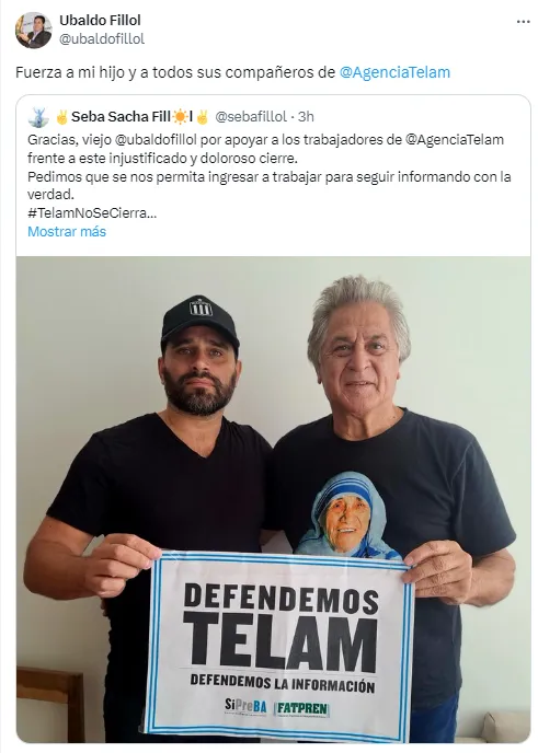 Su hijo Sebastián es uno de los trabajadores despedidos que no pudieron ingresar al edificio tras la decisión del Gobierno. A través de las redes sociales, Fillol se manifestó al sostener un cartel con la leyenda: “Defendemos Télam. Defendemos la información“.