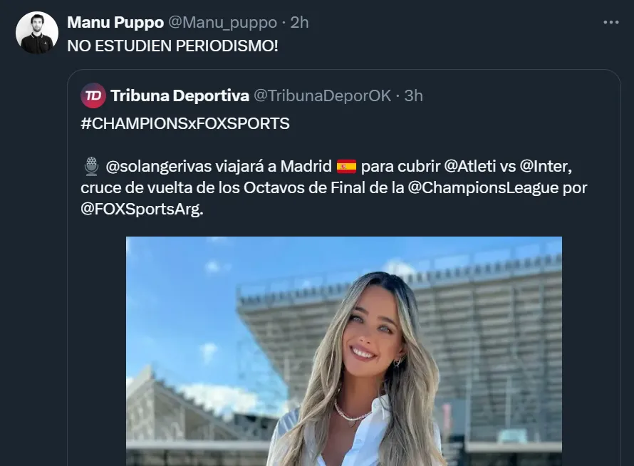 La cronista de 33 años tendrá la ardua tarea de cubrir el gran acontecimiento en el Cívitas Metropolitano, dado a que forma parte del programa ‘La Vuelta’ (lunes a viernes, 18 horas, en Fox Sports). A raíz de esta noticia, los seguidores inundaron las redes sociales con comentarios poco amigables y hasta con un tono sexista.