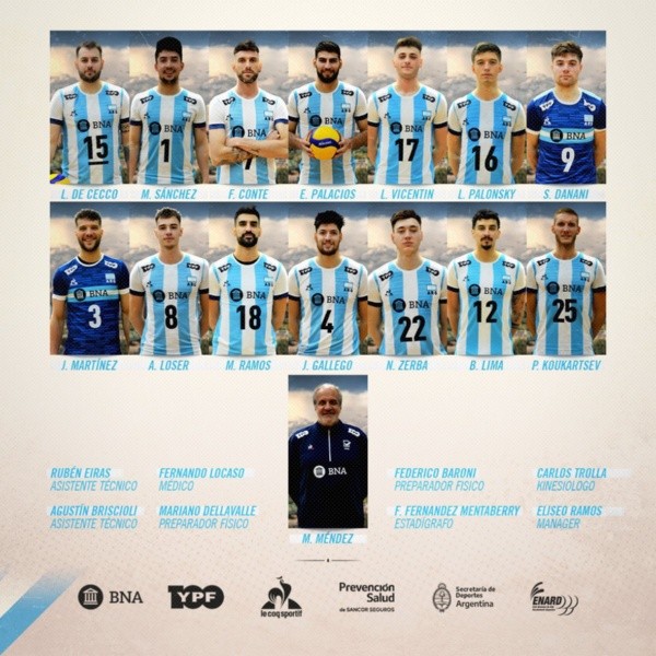 El plantel argentino está compuesto por Luciano De Cecco, Matías Sánchez, Bruno Lima, Pablo Kukartsev, Agustín Loser, Joaquín Gallego, Nicolás Zerba, Martín Ramos, Ezequiel Palacios, Facundo Conte, Luciano Palonsky, Luciano Vicentin, Jan Martínez y Santiago Danani.