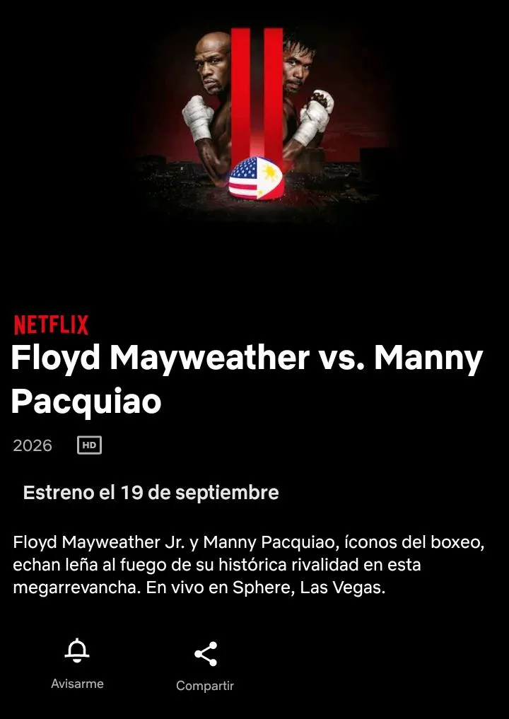 Si bien es evidente que hubo un desencuentro entre la gente de Manny Pacquiao y Netflix con relación a la exhibición ante Ruslan Provodnikov que había sido anunciada para este sábado, la revancha ante Floyd Mayweather que será presentada por esta misma plataforma no parece estar en riesgo ya que continúa figurando en su cartelera, programada para el 19 de septiembre.