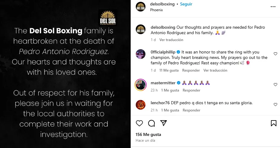 “La familia de Del Sol Boxing lamenta la muerte de Pedro Antonio Rodríguez. Nuestros corazones y pensamientos están con sus seres queridos. Con el respeto a su familia, esperemos a que las autoridades locales completen su trabajo de investigación”, expresó el comunicado de la organización que promovió la pelea de quién acumulaba un récord de 15 triunfos, 25 derrotas y 3 empates.