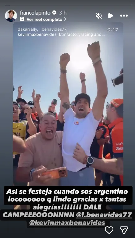 En su cuenta de Instagram, Colapinto reposteó un video donde se puede ver a Luciano y Kevin festejando el triunfo del menor de los Benavides en el Dakar 2026 junto a todo el KTM Factory Racing. Y el mensaje fue alto y claro: “Así se festeja cuando sos argentino loco. Qué lindo, gracias por tantas alegrías. ¡Dale Campeón!“, escribió el piloto de Alpine.
