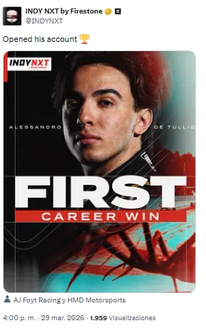 - El piloto logró su primera victoria en Indy NXT en el Circuito de Barber, Alabama.