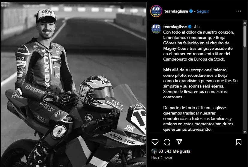 El comunicado del Team Laglisse informando en fallecimiento de Borja Gómez