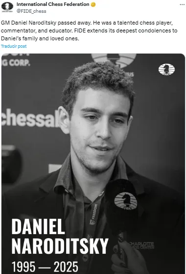 “Falleció el Gran Maestro Daniel Naroditsky. Fue un talentoso ajedrecista, comentarista y educador. La FIDE expresa sus más sinceras condolencias a su familia y seres queridos”, anunció la Federación Internacional de Ajedrez en sus redes sociales.
