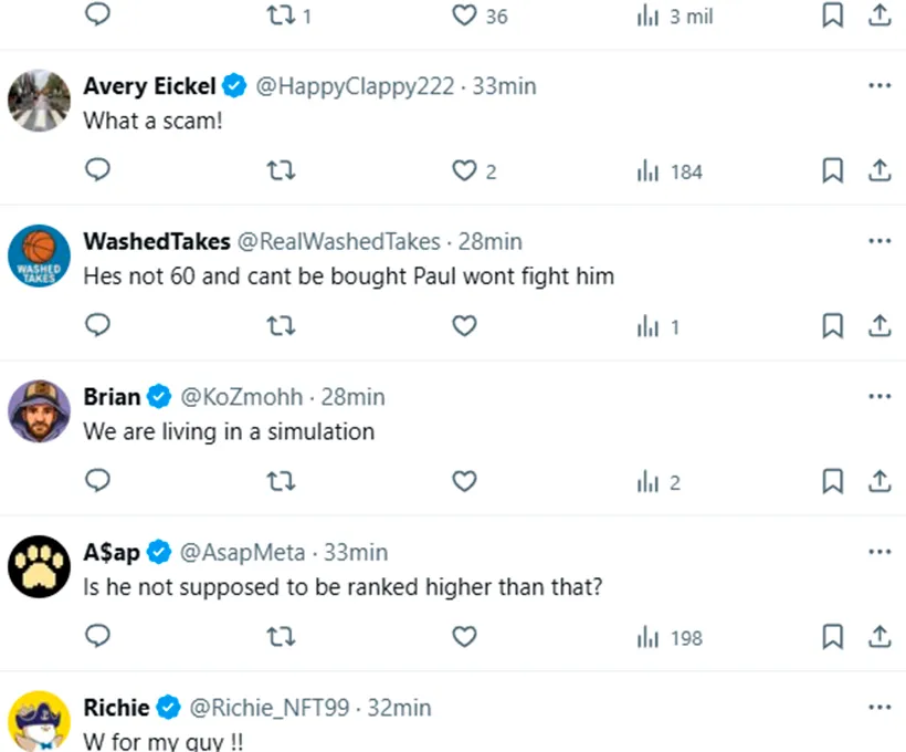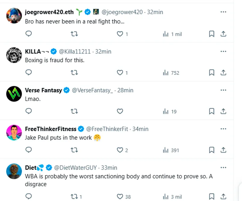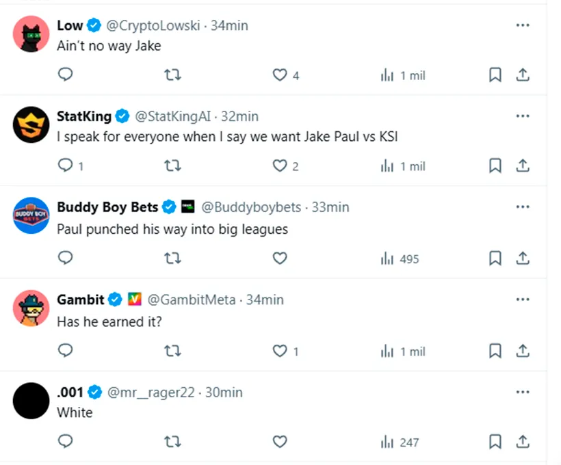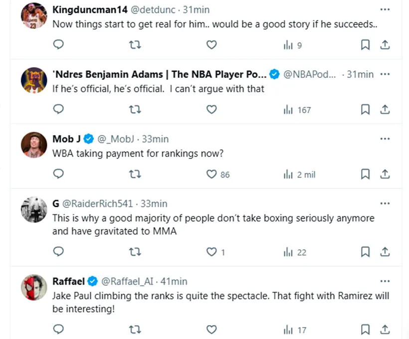 “Bien merecido”, lo celebró uno de esos seguidores. “Paul se abrió camino hacia las grandes ligas”, se enorgulleció otro. “Jake Paul se esfuerza y los puso a trabajar”, destacó un tercero. “¿No debería a ser ranqueado más alto que eso?”, tuvo el descaro de reclamar uno más.