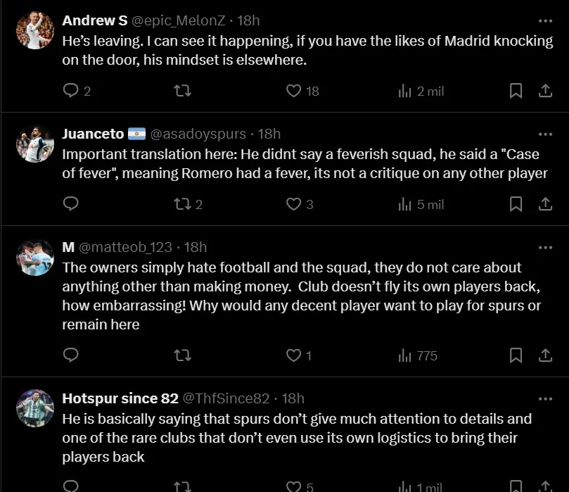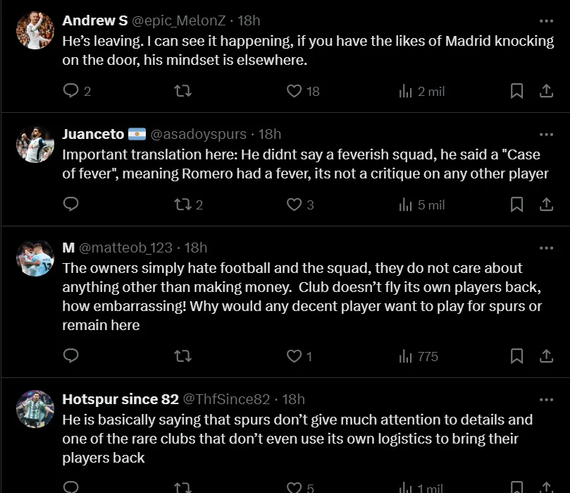 Y si bien los hinchas del equipo londinense no se la agarraron con el argentino por el suceso virtual, sino que incluso estuvieron de su lado, entre las respuestas al posteo aparecieron críticas del público de Tottenham a la gestión administrativa y técnica del equipo. “Si esto es así, es ridículo”, y “los dueños del club odian al fútbol”, fueron algunos de los comentarios más fuertes al respecto.