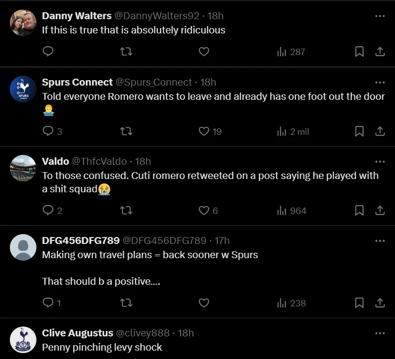 El posteo expresaba que Tottenham había perdido nuevamente con Arsenal y que “no termina de consolidarse para pelear porque no está en los detalles“. A modo de información, el jornalista de TyC Sports sumó: “Fue el único club de la Premier League que recuperó a sus jugadores de su propia selección nacional por sus propios medios y sin su propia logística, como decidieron sus dirigentes. Le dio ventaja porque sus jugadores llegaron con menos descanso que el resto: Cuti Romero jugó con un cuadro febril“.