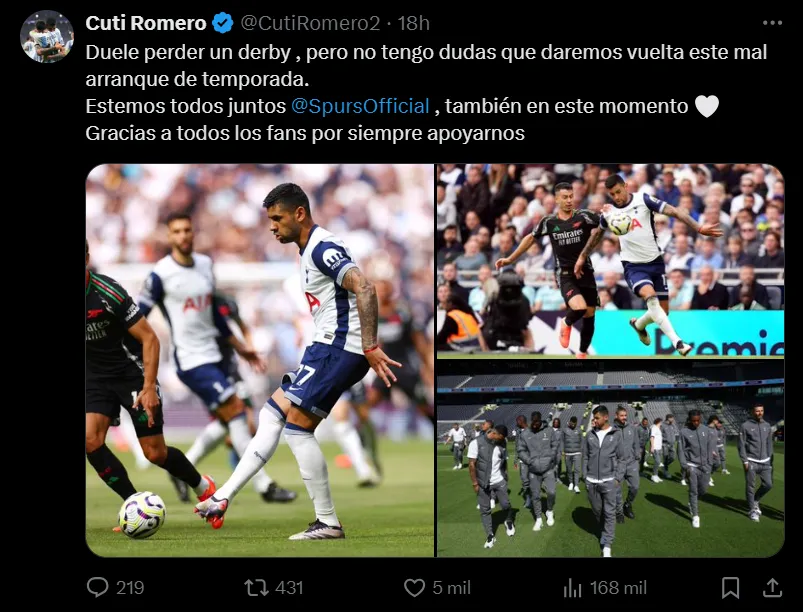 El defensor argentino le dio retuit a dicho posteo terminó dando marcha atrás. Además, publicó un mensaje de apoyo para el equipo a pesar de la dura derrota en el clásico, en el que expresó: “Duele perder un derbi, pero no tengo dudas que daremos vuelta este mal arranque de temporada. Estemos todos juntos @SpursOfficial, también en este momento. Gracias a todos los fans por siempre apoyarnos“.