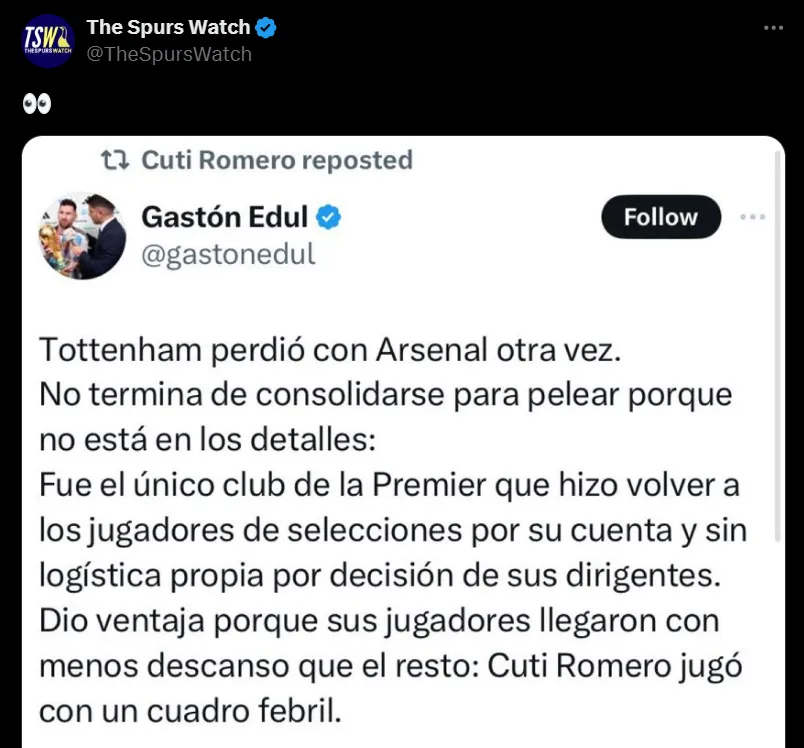 Una vez que la derrota se consumó, el periodista Gastón Edul publicó un posteo en X (ex Twitter) en el que dio detalles desde el punto de vista de la Selección Argentina de lo que sucedió con Cristian Romero en las horas previas al clásico de la capital inglesa. En el medio, deslizó una crítica al manejo de la cúpula dirigencial de los Spurs, y el Cuti le dio retuit a dicha publicación. Momentos más tarde la borró, pero ya se había generado la suficiente repercusión entre los hinchas.